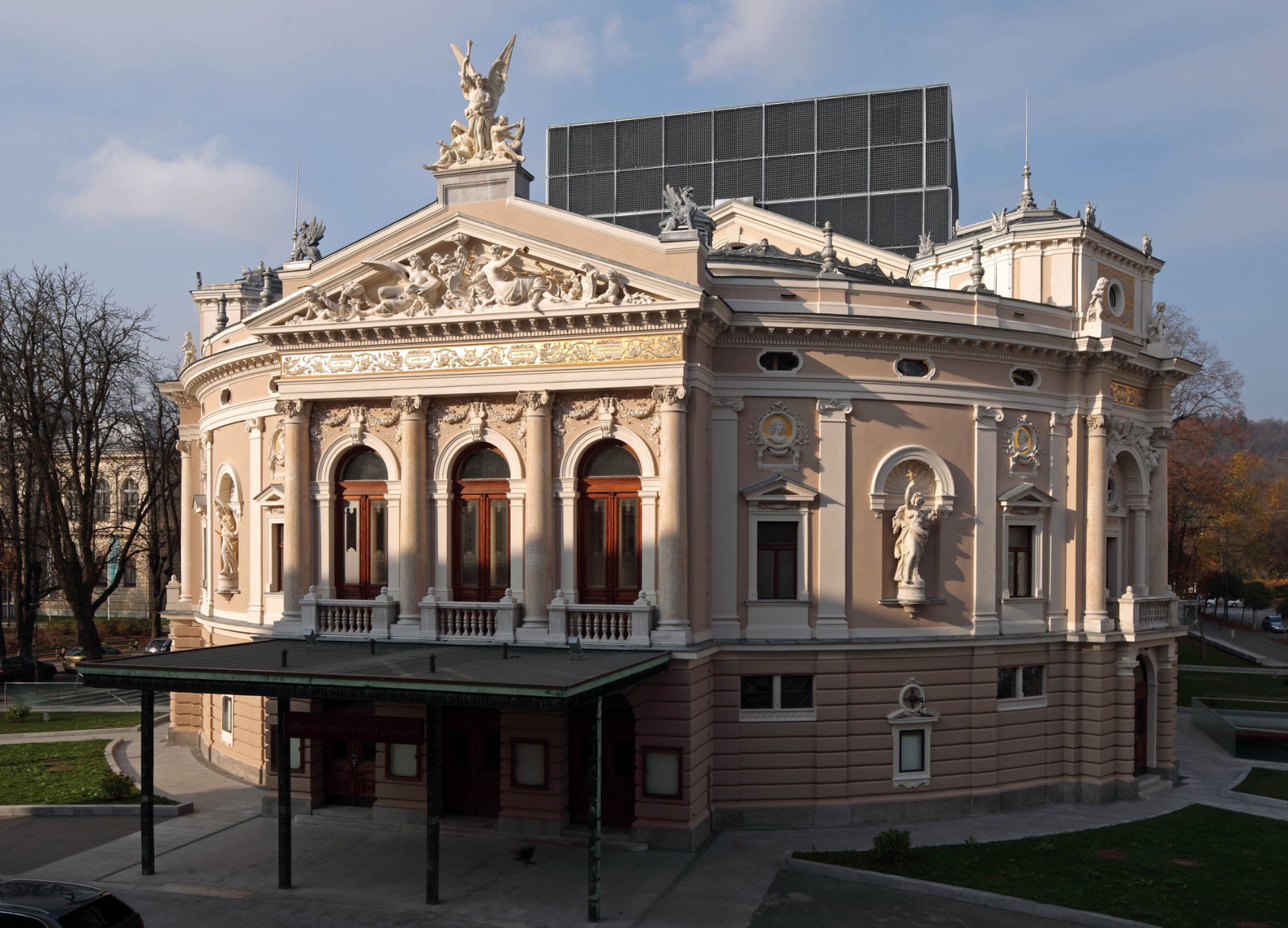 Today’s Slovenian National Theatre Opera and Ballet Ljubljana dates from 1892, being built more or less concurrently with the National Museum of Slovenia, Narodni dom and the Slovenian Philharmonic which are located in the general vicinity. The new Opera and Ballet Theatre was constructed to fill the gap created in 1887 when the Slovenian Estate Theatre was destroyed in a fire, and on the initiative of Ljubljana residents, who sought to turn their town into the political and cultural heart of Slovenian nation. The opera theatre is now listed as a cultural heritage monument. The old building, combining neo-renaissance and neo-classical architectural elements, has undergone renovations with the addition of a new annex – a black cube, containing a fly tower – whose muted form blends in with the darkness of the night.