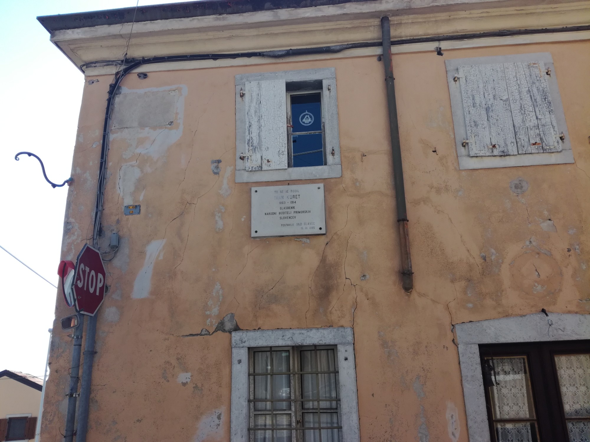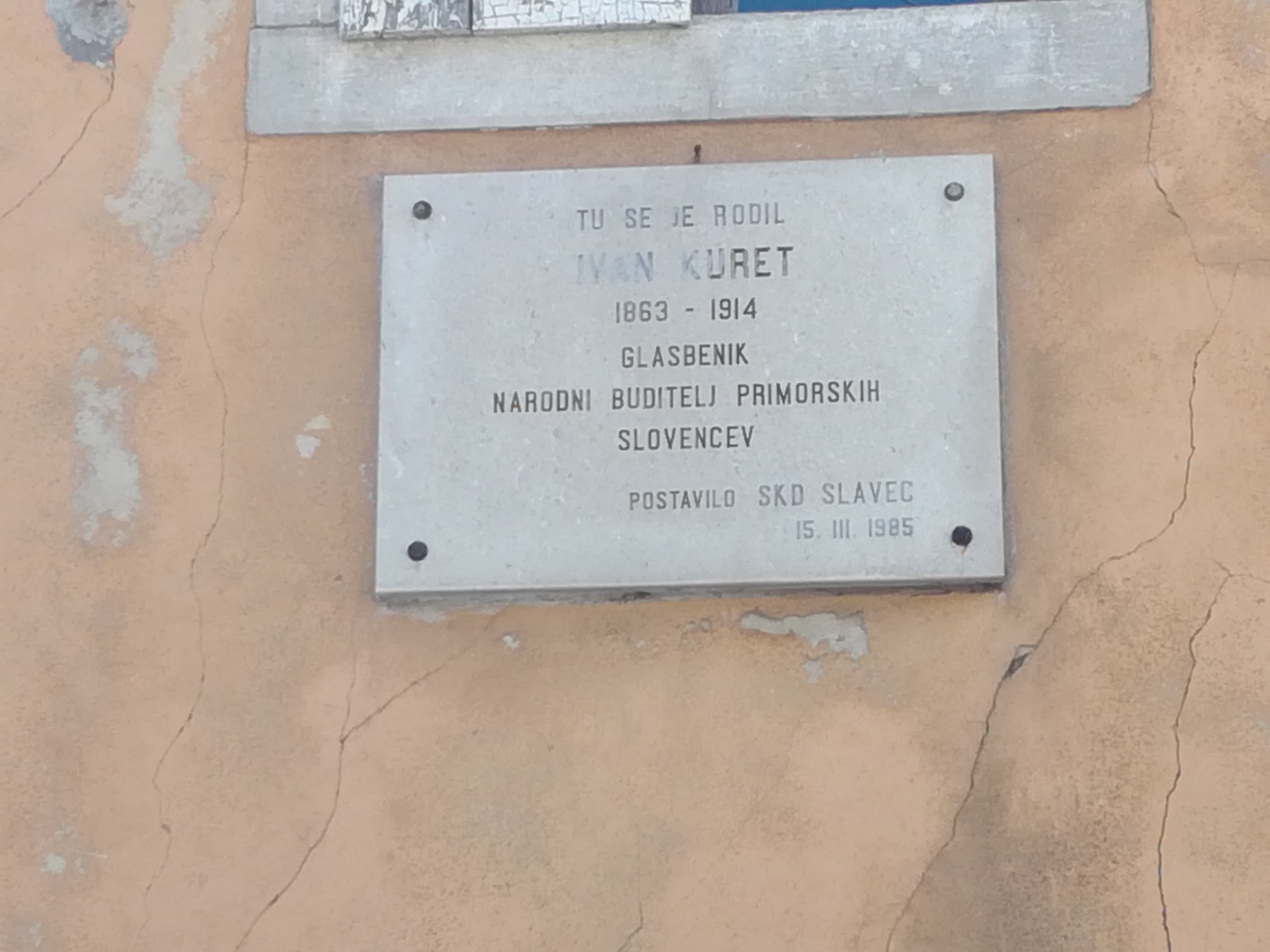 »Tu se je rodil Ivan Kuret, 1863–1914, glasbenik, narodni buditelj primorskih Slovencev.«