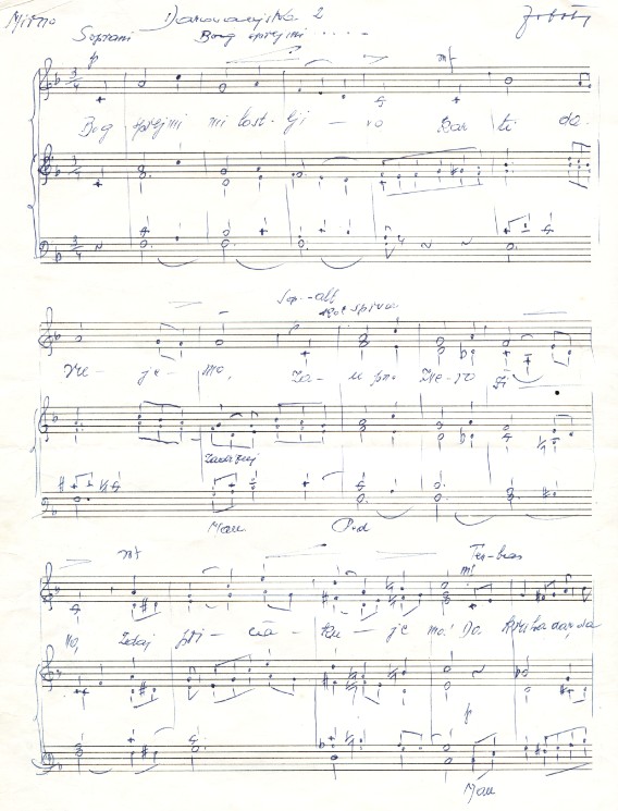 Leta 1912 je ustvaril svojo prvo kompozicijo, mašno pesem Pred Bogom pokleknimo, ki je izšla v Cerkvenem glasbeniku, eni izmed prvih glasbi namenjenih publikacij, ki je na Slovenskem začela izhajati leta 1878. Sledila je izdaja daljšega vokalno-inštrumentalnega ciklusa Petih postnih pesmi za mešani zbor in orgle. V medvojnem obdobju je svoje sakralno glasbeno ustvarjanje stilno nadgradil s klico sodobnega – oddaljil se je od tradicionalne tonalnosti in romantičnega toposa. Tako razširjeni harmonski prostor zasledimo v glasbeni invenciji zadnjega stavka ciklusa omenjenih postnih pesmi, ki nosi naslov Tvoje čem trpljenje peti.